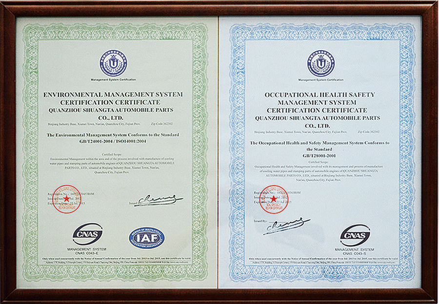 Shuangta Enterprise has established a quality management system based on the TS16949 standard for the automotive industry, and actively promotes the implementation of the ISO14001:2004 environmental management system and the OHSAS 18001:2007 occupational health and safety management system. Through system extension, the quality control of auto parts products has expanded from the traditional production quality control of suppliers by OEMs to raw material suppliers and auxiliary parts suppliers, fully covering the quality system from component suppliers, outsourced production processes to on-site services, so as to ensure full-process quality control.