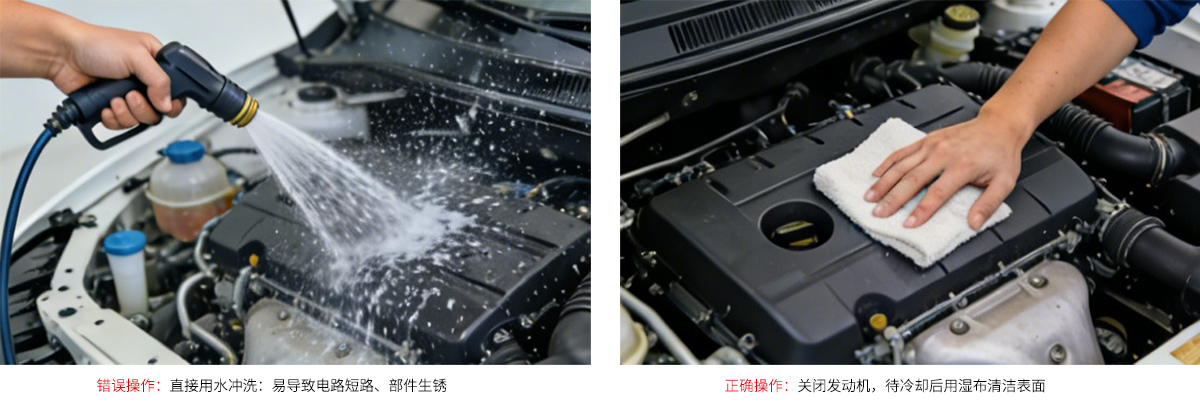 还有一个容易被忽视的误区:热车时直接用水冲洗。发动机运转后会处于高温状态,缸体、缸盖等金属部件温度可达几百摄氏度,此时突然用冷水冲洗,巨大的温差会导致金属部件热胀冷缩,极易出现裂纹、变形,就像滚烫的玻璃突然遇冷会炸裂一样。此外,高温状态下的橡胶部件,比如水管、密封圈,遇冷水会加速老化、变硬、开裂,缩短使用寿命。