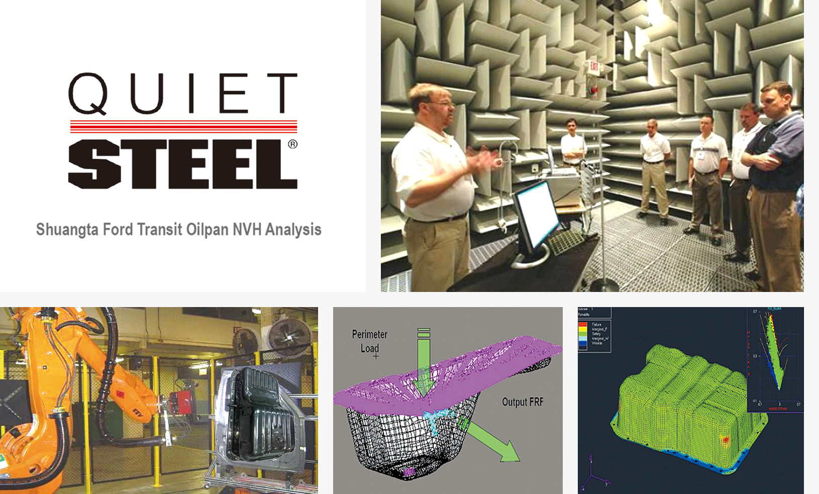 MSC公司在全球的所有工厂都通过了TS/16949&QS9000认证,公司拥有目前全球最先进的静音测试设备实验室,服务于全球汽车业、电子行业、家用电器行业及建筑用料行业。其中汽车业务模块——车身结构件、刹车系统、动力总成及底盘件进行振动噪音测试分析,并提供业界最具权威的数据报告。